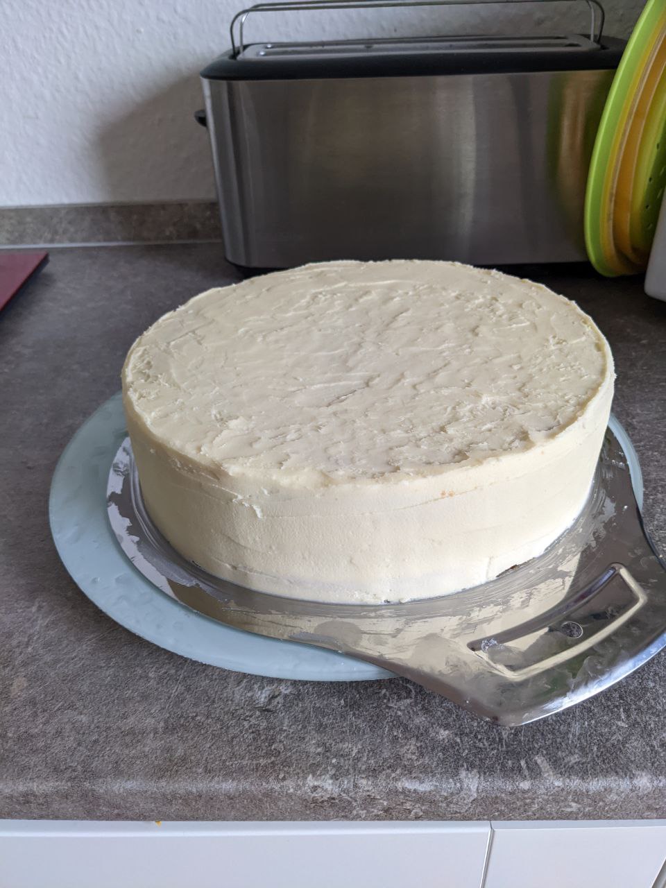 Am Folgetag habe ich die Ganache mit einem Mixer aufgeschlagen. Außerdem habe ich den Kuchen mit Hilfe einer Kuchensäge erst begradigt und dann in drei gleich dicke Böden unterteilt. Anschließend habe ich die unteren beiden Böden mit der Fruchtfüllung bestrichen und den Rand mit etwas Ganache davor gesichert, dass Füllung nach außen gelangen kann. Danach habe ich die Böden übereinander gestapelt und die Torte gleichmäßig mit der restlichen Ganache eingestrichen.